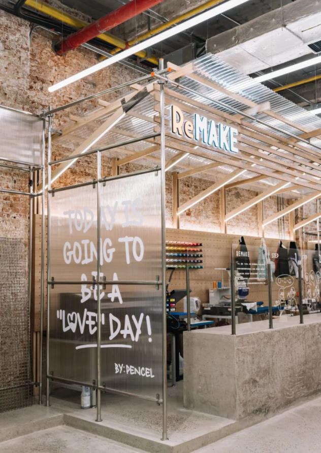 PENCEL的原創服裝大多采用撞色、撞料設計,大部分衣服可拆卸,實現“一衣多穿”。顧客不僅可以在店內選購衣服,還可以在專門設置的手作區——Re Make,進行靈感的創作,你可以完全根據自己的喜好或一瞬間的idea打造屬于你的定制款。
